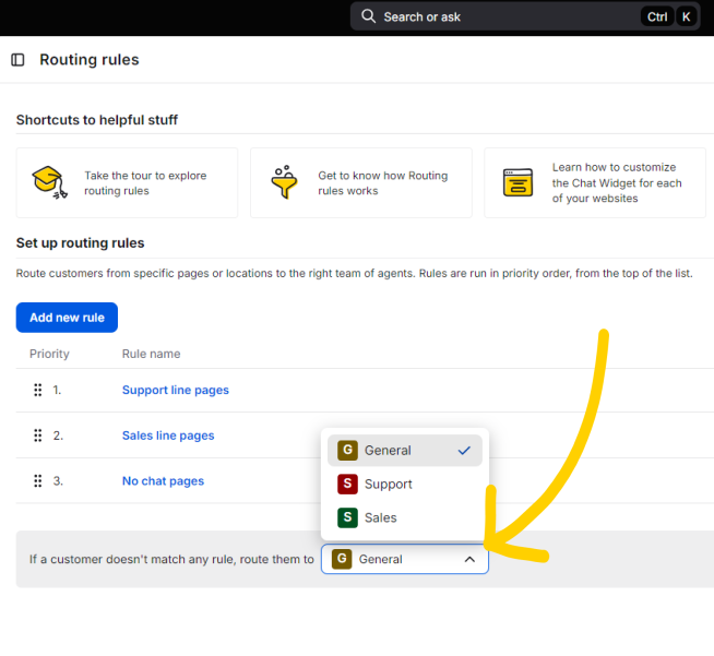 Routing rules allow you to direct customers from specific pages or locations to appropriate teams of your agents.