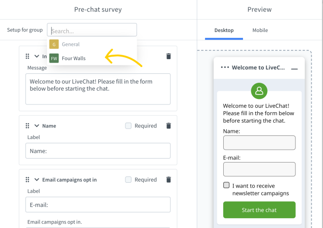 From the drop-down menu select the group for which you want to edit the pre-chat form (this option is available when you have more than one group set up on your license).